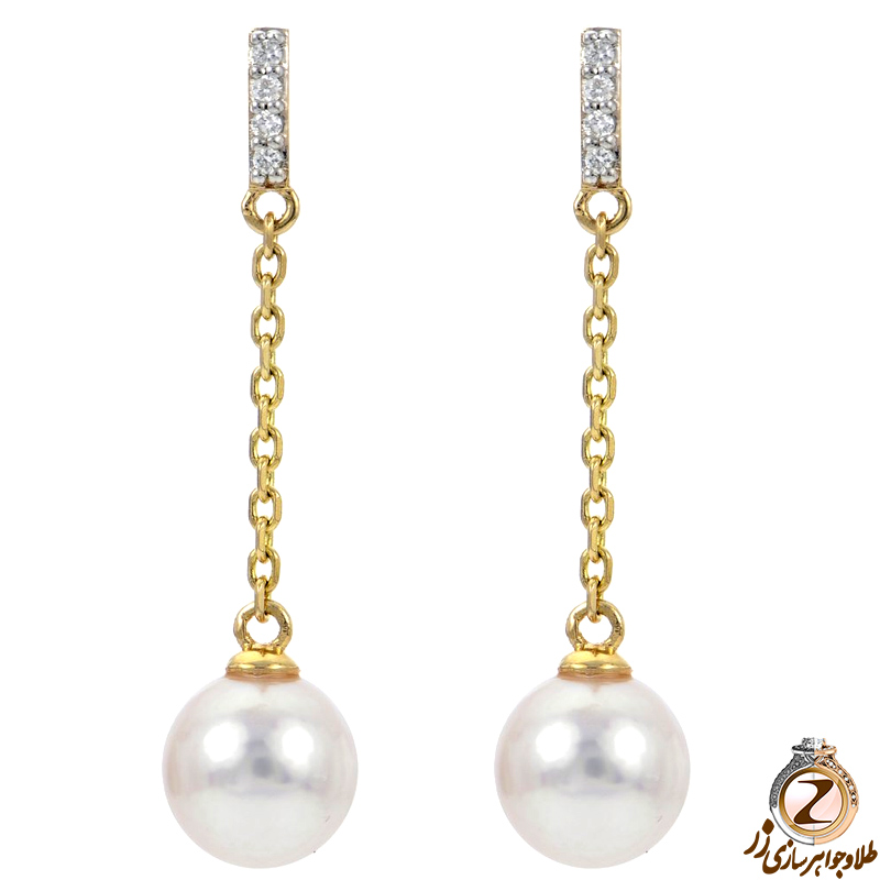 گوشواره طلا و مروارید زنانه جواهر جدید با نگین الماس تراش برلیان و طلای زرد 18 عیار طرح زنجیری بلند مدل: edf1708