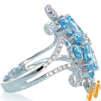 انگشتر طلا که در تصویر ملاحظه می کنید با رکاب طلای سفید از یک تاج طرح گل تشکیل شده است. رکاب انگشتر هرچه به سمت روی انگشتر می رود دوشاخه می شود تا طرح گل جذاب تر دیده شود. در مرکز تاج انگشتر یک نگین الماس برلیان درشت قرار داده اند که پیرامون ان نگینهای توپاز مارکیز و گرد به شکل گل چیده شده اند. روی رکاب انگشتر نیز نگینهای الماس تراش برلیان چیده اند تا این مدل جذاب و باشکوه شکل بگیرد.