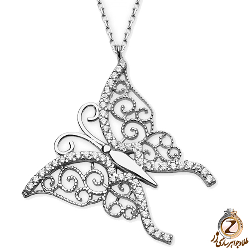 پروانه یکی از جذاب ترین طرحهای زنانه به حساب می آبد که در قالب طلا و جواهرات بسیار پرطرفدار است. در این آویز طلا هم از طرح پروانه به خوبی بهره برده و یک مدل بی نهایت زیبا و دلنشین را فراهم کرده اند. آویز با پایه ی طلای سفید یک پروانه را نشان می دهد که از یک بال به پاپیونی متصل شده است. روی بالهای پروانه طرحهای سنتی خاصی را پیاده کرده اند تا طرح جذاب تر و دلنشین تر بشود. برای درخشش بیشتر این آویز طلای سفید بر گردن روی بخشهایی از آن نگین الماس تراش برلیان چیده اند. علاقه مندان به طرح پروانه می توانند این آویز الماس را از طلای زرد یا رزگلد هم سفارش بدهند.