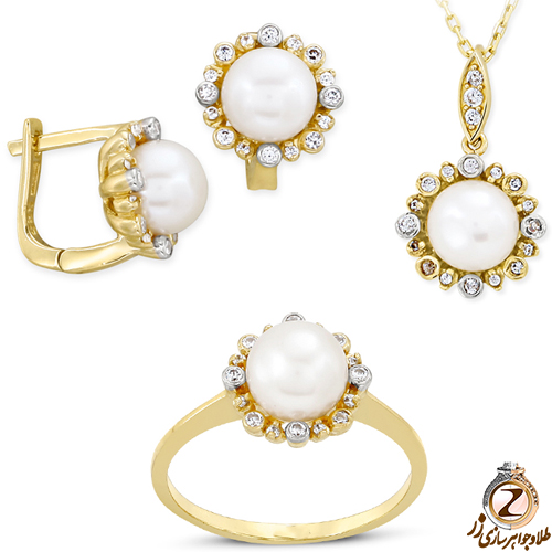 اکثر دخترخانمهای جوان به مروارید علاقه مند هستند و این نیم ست مروارید بهترین گزینه برای آنهایی است که عاشقانه مروارید را دوست دارند. نیم ست پیش روی شامل گوشواره، گردنبند و انگشتر است که از جنس طلای زرد با نگینهای درشت مروارید بسیار زیبنده ی دخترخانمهای باسلیقه خواهد بود. آنچه این نیم ست طلای زرد را خواستنی تر می کند نگینهای تراش برلیانی است که در آن کار شده است. قرارگیری نگینهای تراش برلیان در کنار مروارید زیبایی باشکوهی به این نیم ست بخشیده است که باعث درخشش شخص در مهمانی می شود.