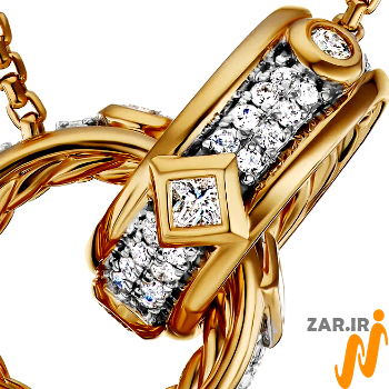 گردنبند شامل دو دایره جواهرنشان است که با طراحی خاص داخل هم قرار گرفته اند. امروزه گردنبندهای دو حلقه طرفداران بسیاری دارد و این طرح جواهر نشان با ترکیب جذاب الماسهای تراش برلیان و تراش پرنس میتواند یک انتخاب متفاوت از یک ترند همه پسند باشد.