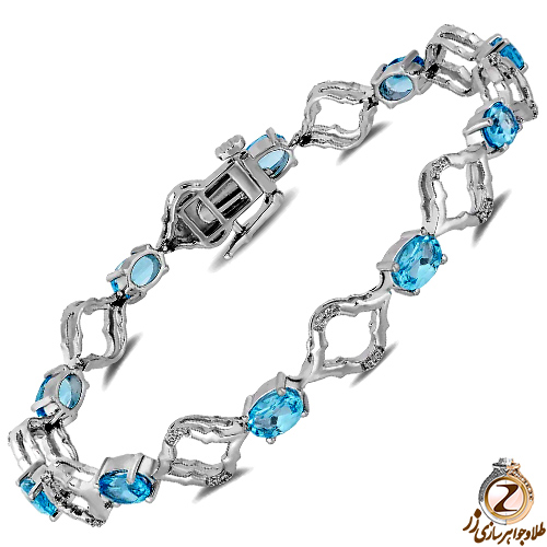 این دستبند طلا سفید زنانه ترکیب جذابی از طلای سفید و نگین آبی رنگ توپاز است. ترکیب رنگی خارق العادهای که ضمن رعایت هارمونی رنگ ها، آرامش زیادی را از نظر بصری به بیننده القا میکند.
