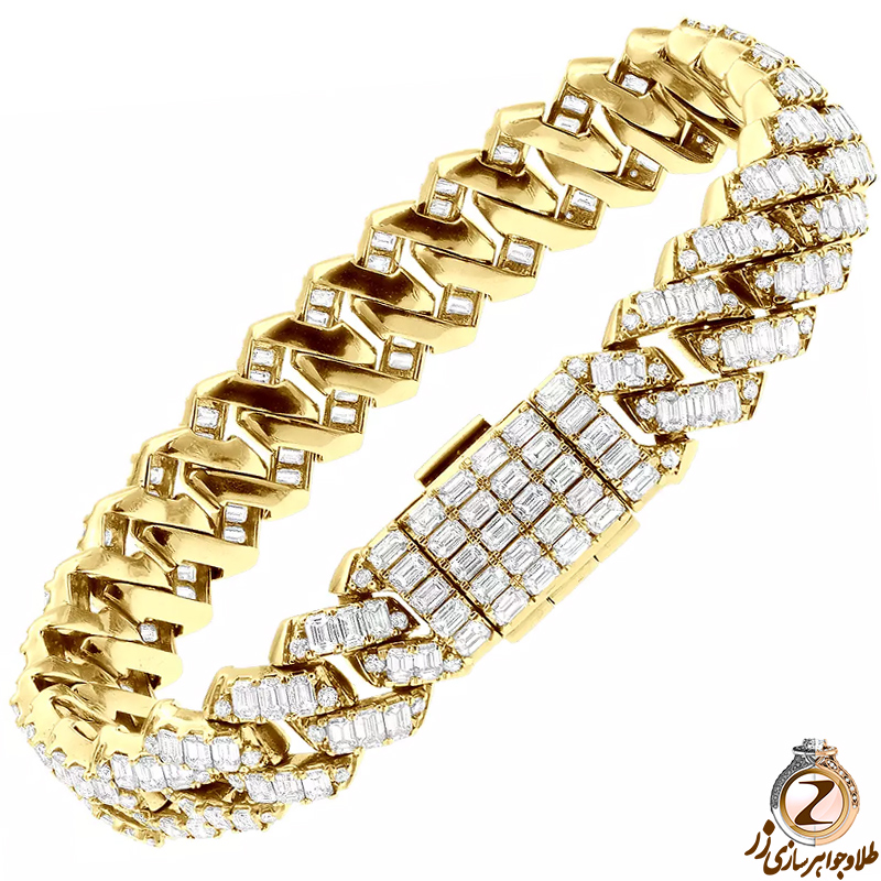 انتخاب این طراحی برای دستبند مردانه طلا زرد به همراه نگین های الماس هارمونی زیبا و دلپذیری را برای این جواهر مردانه ایجاد کرده است. این دستبند زیبا نماد مردانگی و ایستادگی است. بر روی هر کدام از حلقه های زنجیر الماس هایی را مشاهده می کنیم که تراش آن ها به شکل باگت می باشد. استفاده از تراش باگت باعث شده ظاهر کار مردانه تر به چشم بیاید. طرح زنجیر در گذشته معمولا توسط دریانوردان اسرار آمیز استفاده می شده است، در حال حاضر یکی از رایج ترین طرح های مردانه در دنیای جواهرات به شمار می آید. می توانید با انتخاب دستبند طلا مردانه زنجیری مانند یک دریانورد جسور و پر رمز و راز به چشم بیایید. سنگ الماس یکی از محبوب ترین سنگ های جواهر در بین آقایان می باشد که سطح این کار پوشیده از آن می باشد.