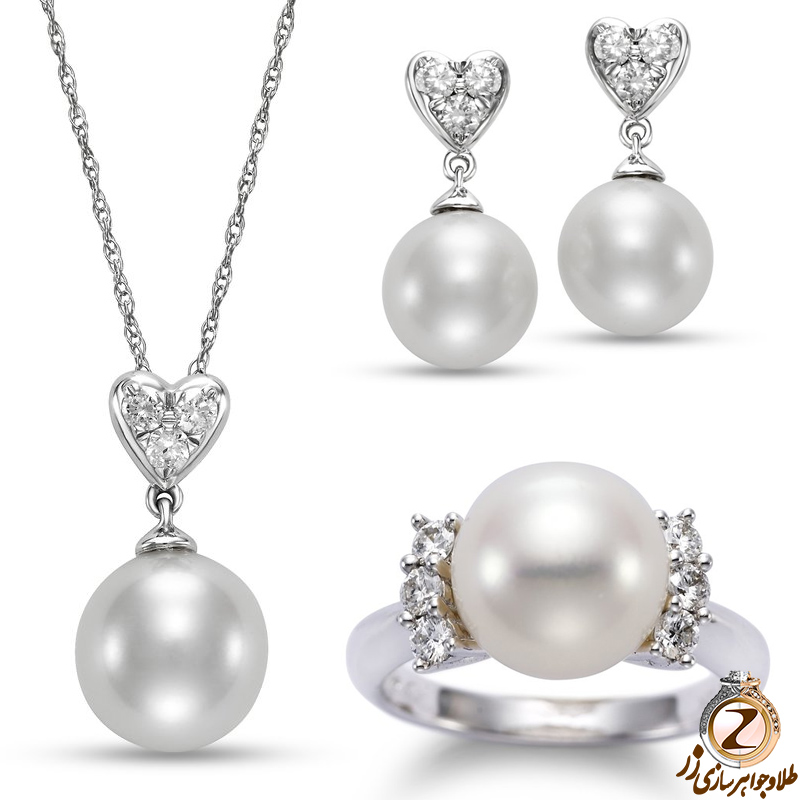 نیم ست قلب طلا زنانه مروارید در بالای نگین اصلی برای گوشواره و گردن آویز با استفاده از یک قلب بسیار ظریف و زیبا که از جنس طلای سفید ساخته شده که بر روی آن الماس های تراش برلیان با ظرافت زیبایی به کار رفته است از طریق این بخش اکسسوری به قلاب وصل می شود. مروارید به کار رفته بر روی انگشتر نیز از دو طرف توسط یه الماس تراش برلیان احاطه شده است. این طراحی تداعی کننده مروارید درون صدف می باشد. انتخاب طلای سفید برای ساخت این نیم ست باعث شده جلوه ی کار چند برابر شده و از طراحی کلاسیک فاصله بگیرد. این سنگ زیبا مانند عمق دریاها بکر و پررمز و راز می باشد.