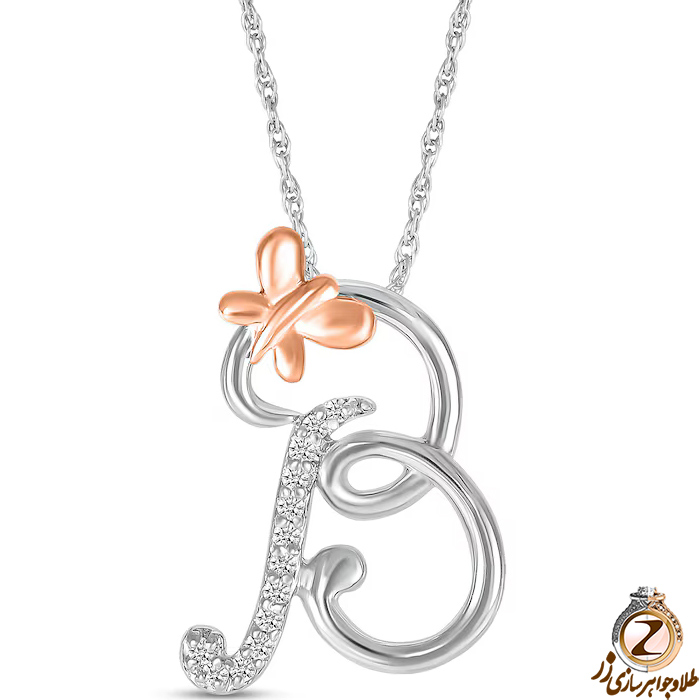 خرید و قیمت گردنبند و پلاک طلا حرف انگلیسی B مدل و طرح دخترانه و زنانه پروانه با طلای سفید و رزگلد و برلیان - سایت زر