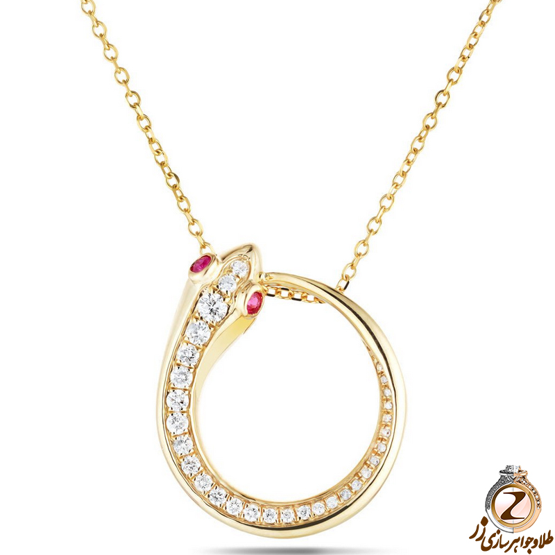 خرید پلاک گردنبند و آویز مار طلا زرد زنانه 18 عیار و نگین جواهر یاقوت سرخ و برلیان طرح دایره در سایت زر