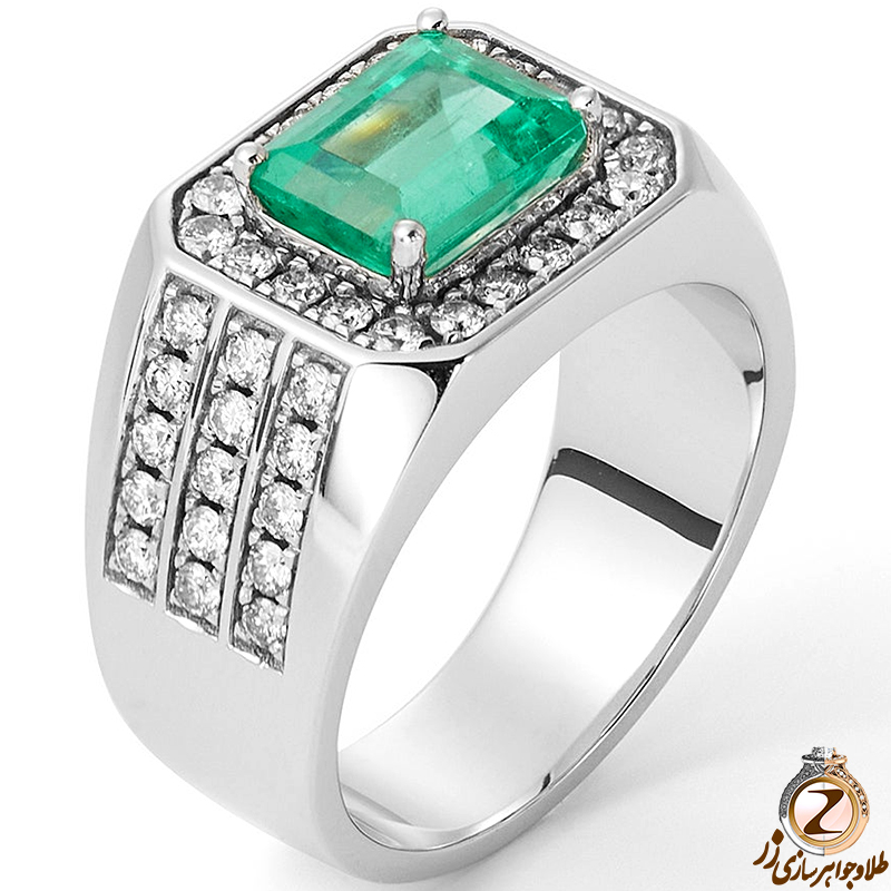 انگشتر طلا مردانه با نگین زمرد مطابق روحیات و خصلت های مردانه طراحی شده است.استفاده از طلای سفید به همراه یک نگین نسبتا درشت زمرد با تراش کاشین زوایای کار را کاملا مردانه کرده است. در اطراف نگین اصلی از الماس هایی با تراش برلیان استفاده شده است، که باعث شده زیبایی و درخشندگی زمرد بیشتر به چشم بیاید