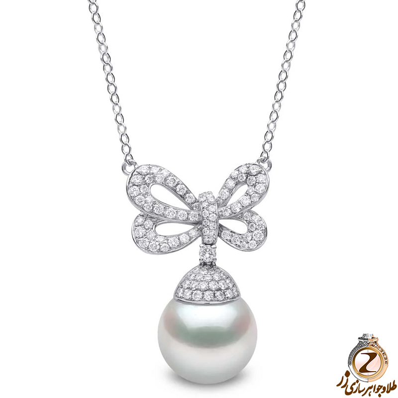 معرفی گردنبند پاپیون طلا سفید و نگین جواهر الماس تراش برلیان و مروارید سفید